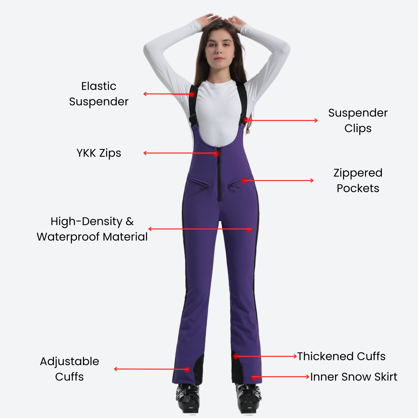 Inner Snow Skirt, Reinforced Knees, Adjustable Cuffs, Bib Design, Adjustable Elastic Straps, Ample Storage Pockets |